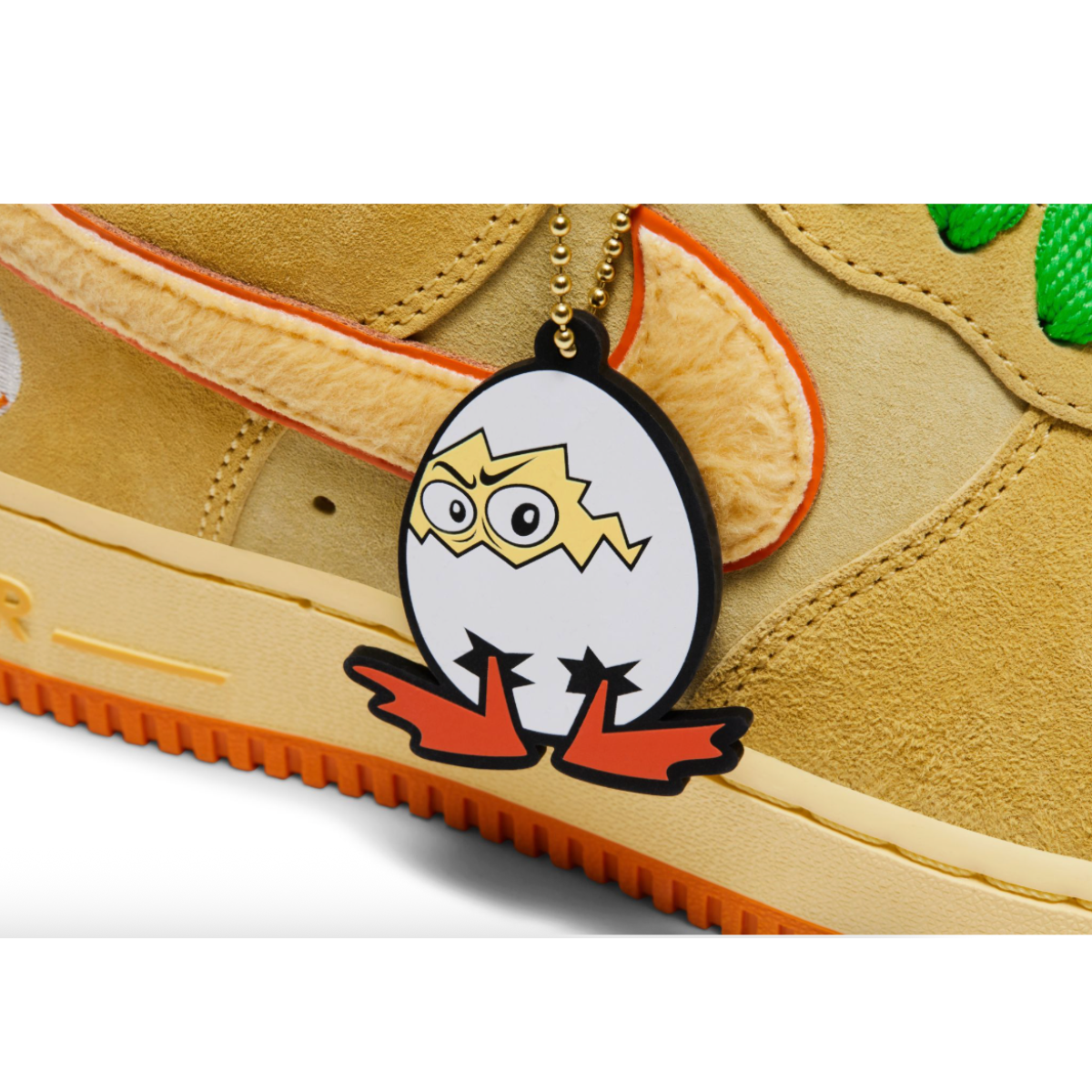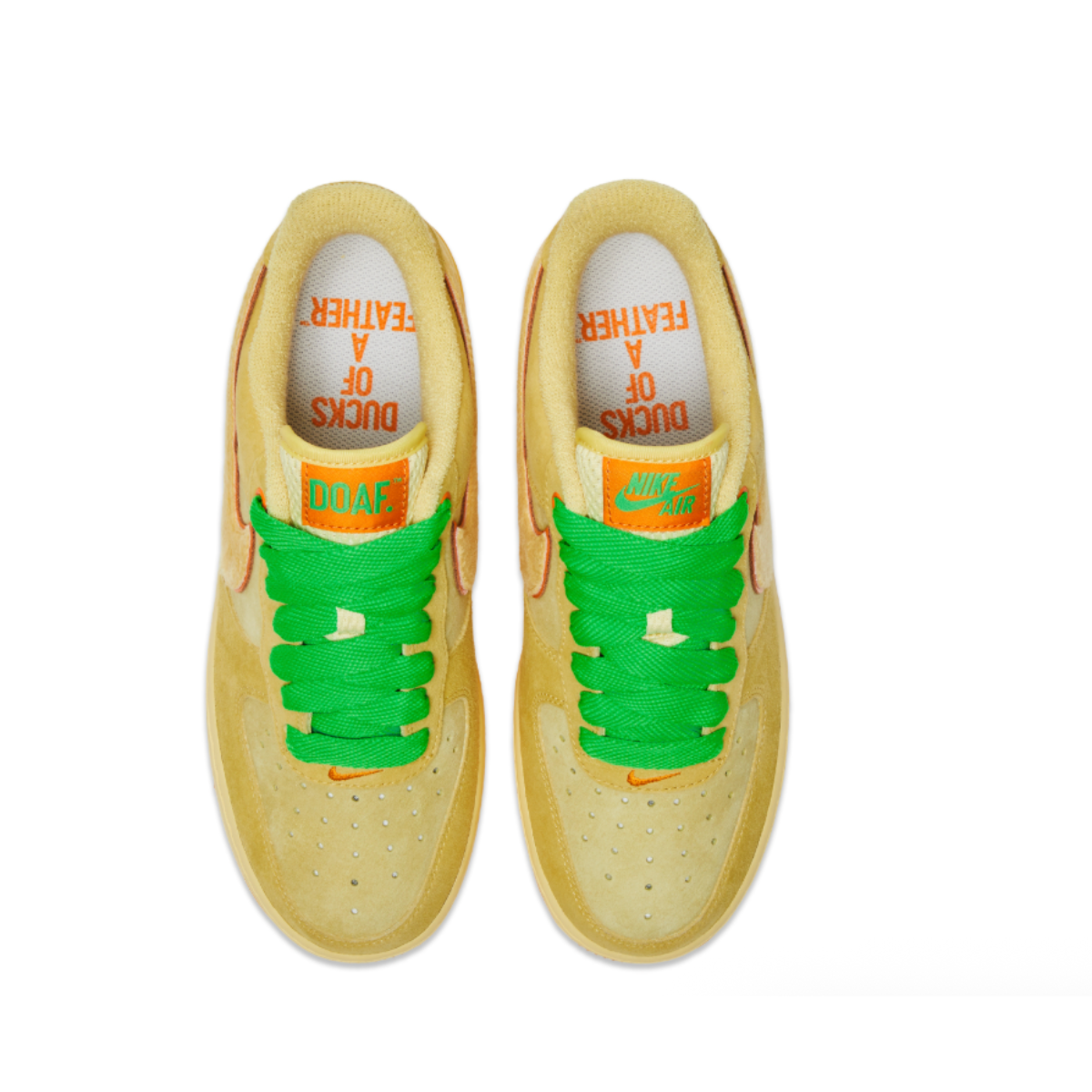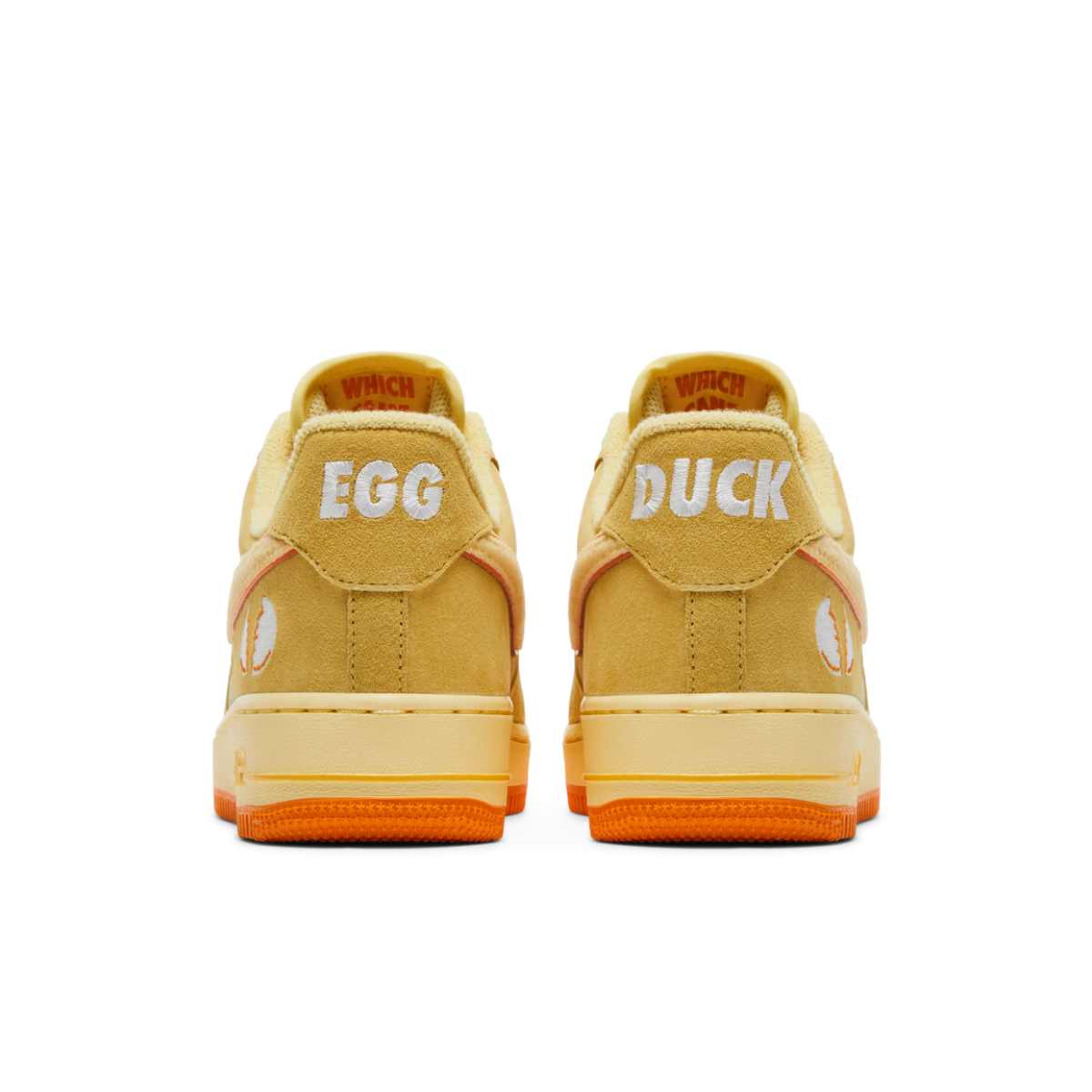 The DOAF x Nike Air Force 1 Low “Duck or Egg” features a combined leather and suede upper with a flocked textile Swoosh logo and a terrycloth sock-liner—all done in shades of Soft Yellow, Topaz Gold and Bright Ceramic, accented with an orange-red outsole and piping underneath the Swoosh and bright green laces. An embroidered design of a cracked eggshell on the heel counter adds a distinctive touch, as do the words “Egg” and “Duck” embroidered on the back of the left and right shoes, respectively.