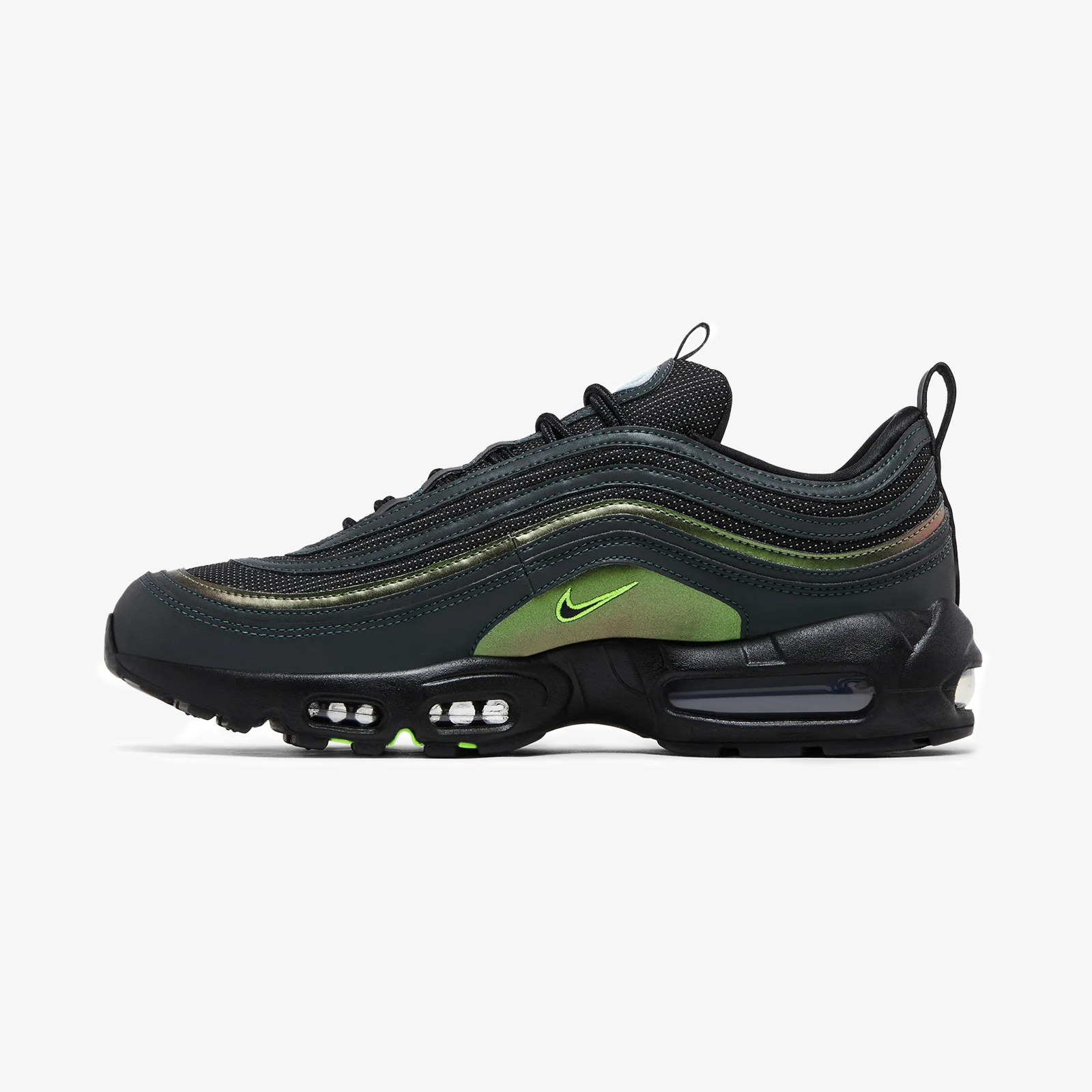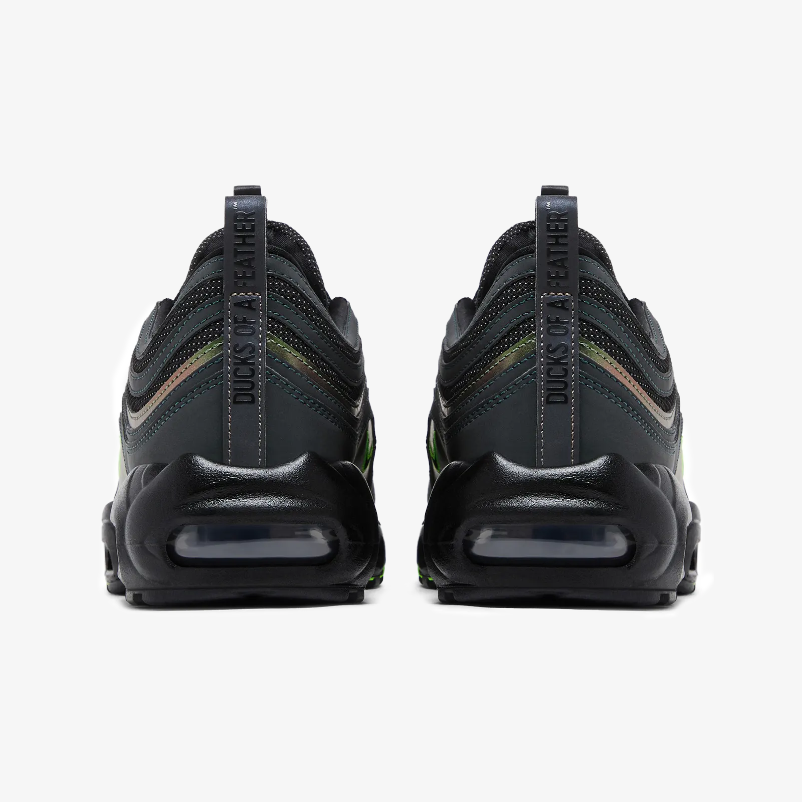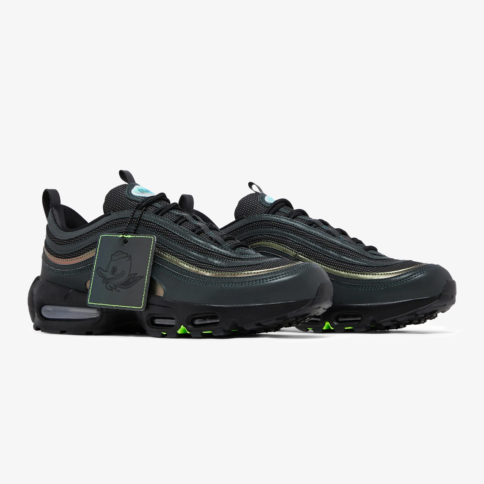 Created by Division Street’s Ducks of a Feather, the Air Max 95/97 'University of Oregon - Thunder' PE embodies the unique elements of the Pacific Northwest. Honoring the region’s natural beauty, the AM97 upper features obsidian reflective overlays anchored by two-tone underlays. Gold-green panels at the midfoot are detailed with mini Swooshes. Dark jade branding lands on the rear pull tab. Lenticular Nike and DOAF labels arrive on the tongue tags. The sockliners, emblazoned with mismatched Oregon motifs across the left and right inserts, are covered in a triangle pattern recalling the school’s football uniforms. The AM95’s signature molded midsole is outfitted with visible Air windows and internal support pillars that glow green in the dark. Underfoot, the spine bears the university’s “O” logo. Proceeds benefit participating Oregon student-athletes.