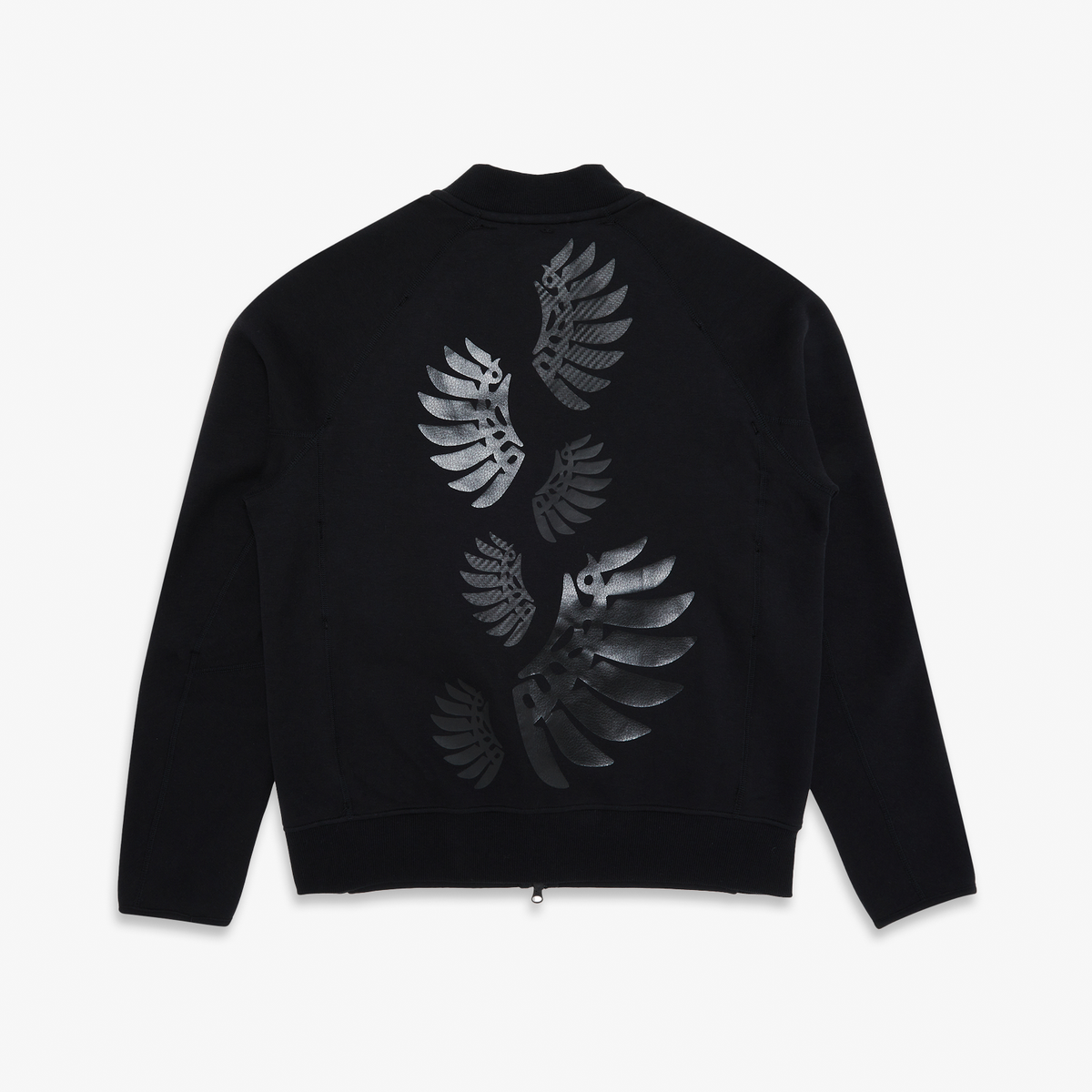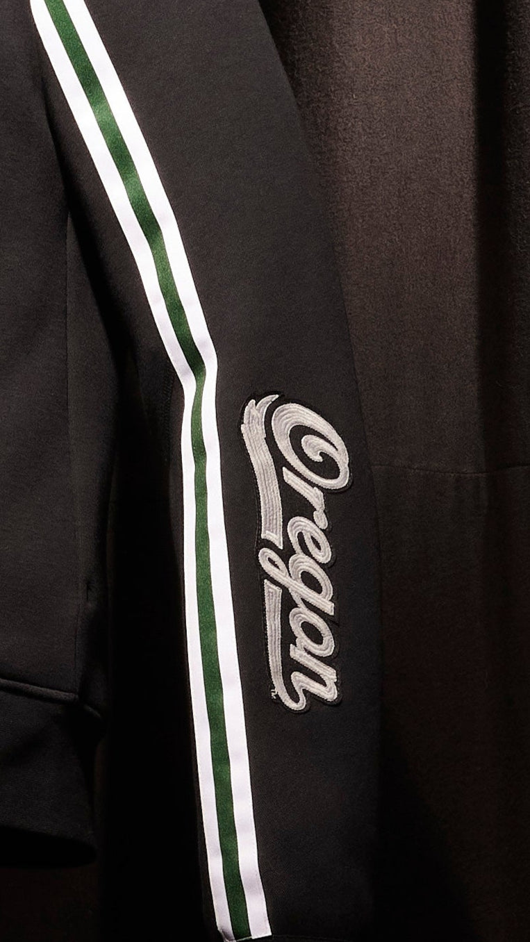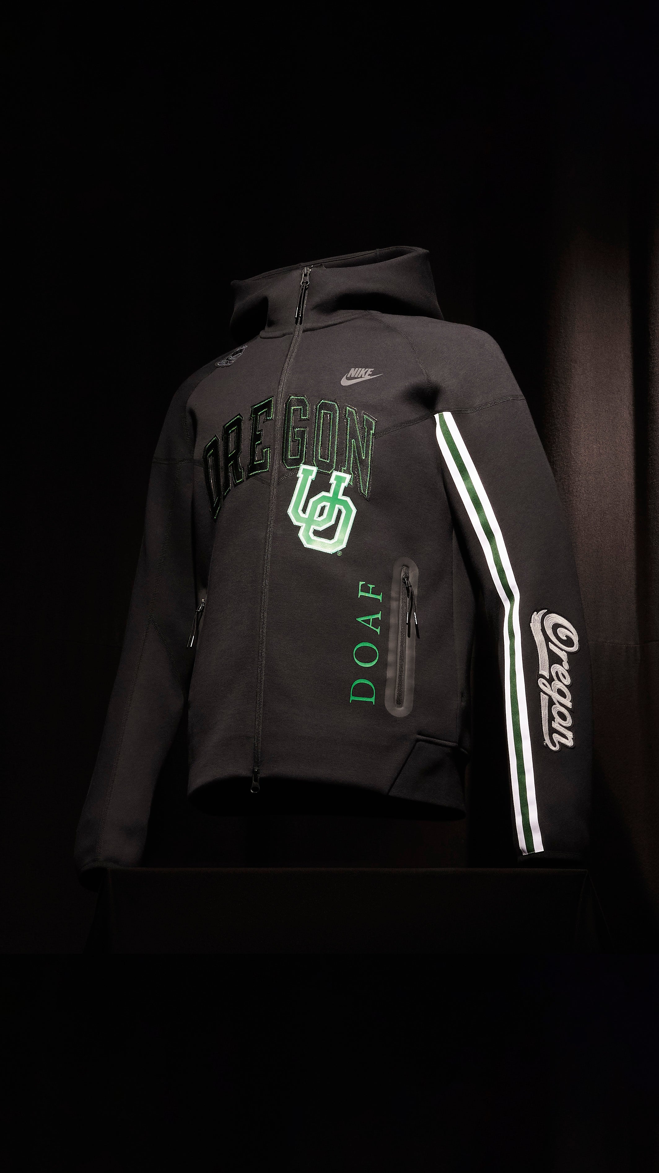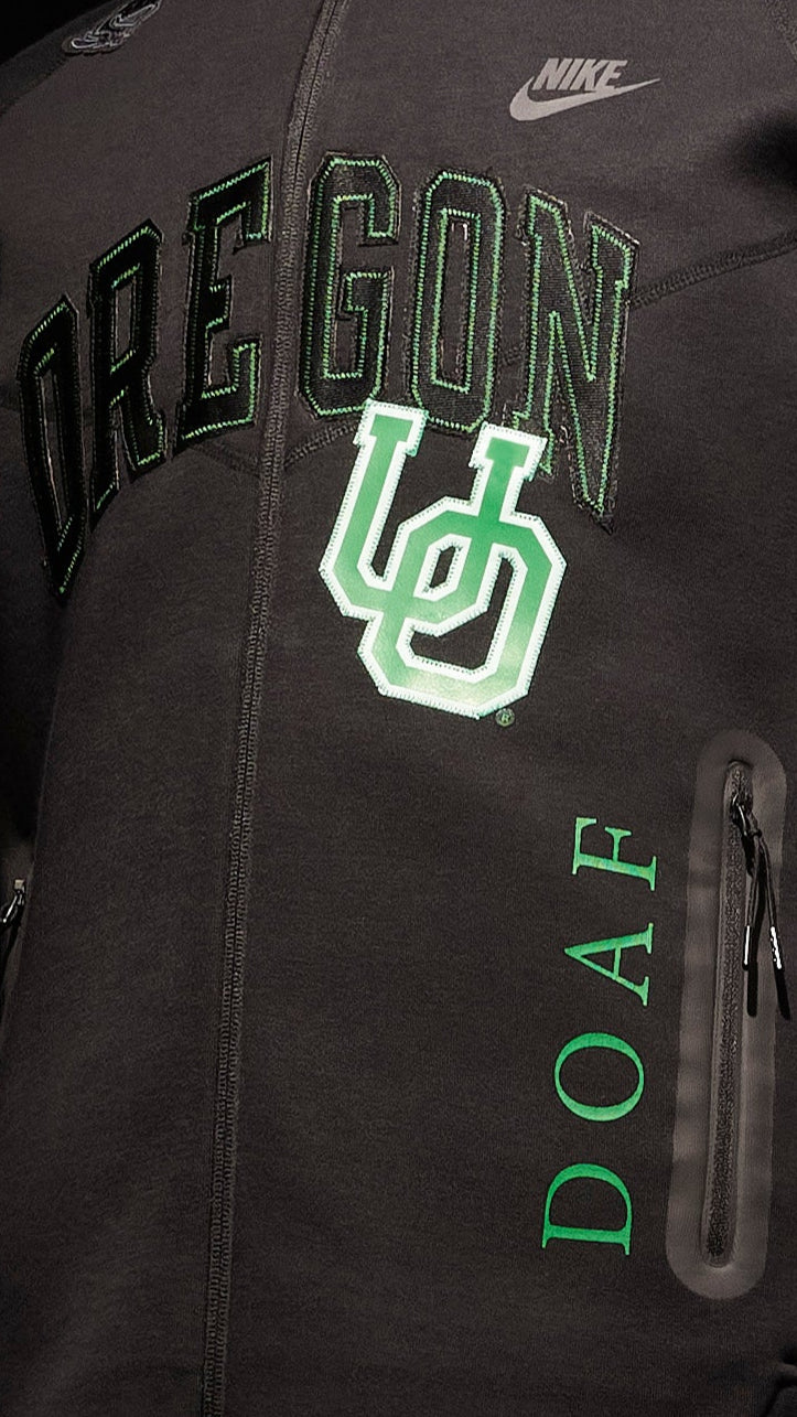 This limited-edition bomber jacket is inspired by the Dunk Low ‘What the Duck - University of Oregon Alternate’ PE. Constructed from Nike Tech Fleece, the style pays homage to iconic University of Oregon motifs. Varsity-inspired “UO” lettering lands next to the front zip pocket, complemented by a green stripe along the right sleeve. The stitched-in jersey liner is built from traditional uniform materials, anchored by a multicolored duck graphic. A glossy wing pattern, informed by the “Black Wing” football jerseys worn from 2008 to 2010, arrives on the back.