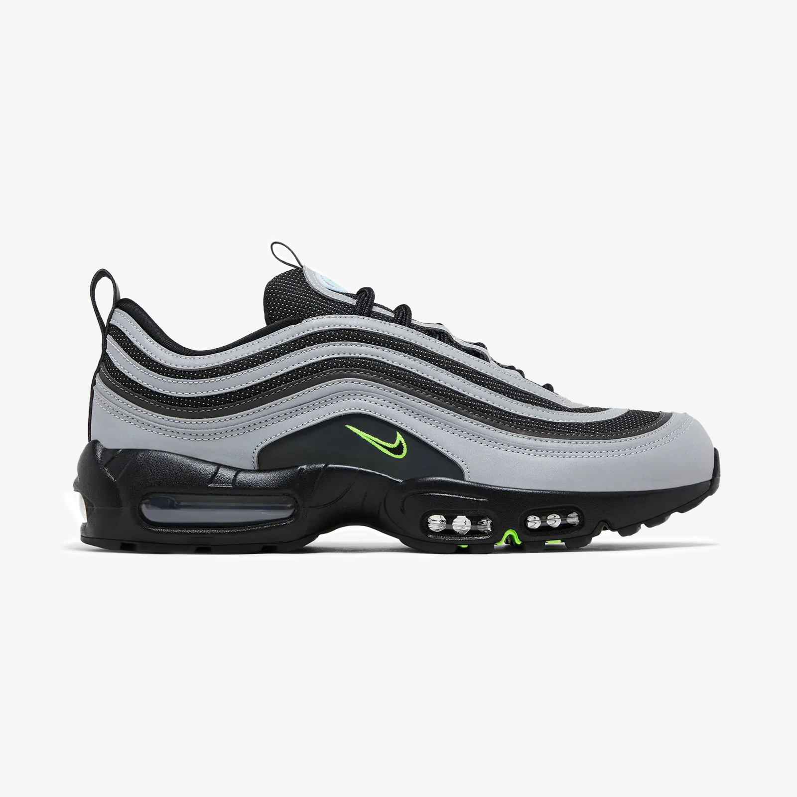Created by Division Street’s Ducks of a Feather, the Air Max 95/97 'University of Oregon - Lightning' PE embodies the unique elements of the Pacific Northwest. Honoring the region’s natural beauty, the AM97 upper pairs silver overlays with two-tone reflective mesh underlays. An aurora-hued reflective textile sits at the midfoot, punctuated by a mini Swoosh. Dark jade branding lands on the rear pull tab. Lenticular Nike and DOAF labels arrive on the tongue tags. The sockliners, emblazoned with mismatched Oregon motifs across the left and right inserts, are covered in a triangle pattern recalling the school’s football uniforms. The AM95’s signature molded midsole is outfitted with visible Air windows and internal support pillars that glow green in the dark. Underfoot, the spine bears the university’s “O” logo. Proceeds benefit participating Oregon student-athletes.