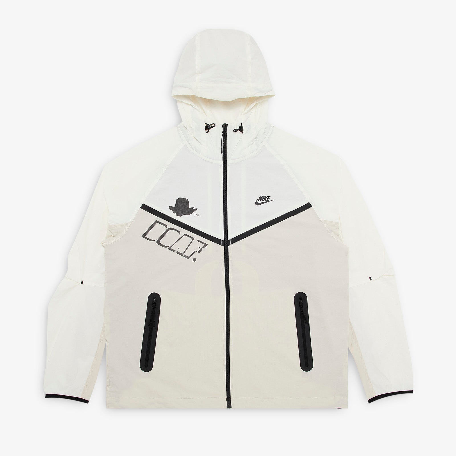 Ducks of a Feather and Nike come together on a woven tech jacket. Inspired by the concept of transcendence, the outerwear piece is constructed from a breathable and lightweight textile, rendered in neutral shades of cream and ivory. Contrasting hits of black land on the chest chevron piping, central placket and pockets. Nike, DOAF and University of Oregon motifs arrive on the front and back. The rear panel is detailed with a web-like graphic featuring reflective film overlays and laser-textured treatments. Articulated elbows, a two-way zipper and bungee cords at the hem and hood ensure a customizable fit.